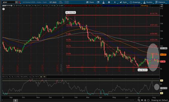 En este contexto, el Índice del Dólar Americano, US Dollar/USDX-Index-Cash ($DXY), mostró movimientos relevantes tras la publicación de datos económicos estadounidenses y los comentarios del mandatario estadounidense en cuanto a demandar y destituir a Jerome Powell como Presidente de la Reserva Federal (FED), llevando al $DXY a caer desde el máximo alcanzado a principios de la semana ubicado en 99.34 Unidades hasta registrar un mínimo en 97.53 Unidades, cerrando la jornada del viernes 15 de Agosto en 97.57 Unidades, posicionándose el Índice de Fuerza Relativa (RSI) en territorio neutral con sesgo a la baja, dejando abierta la posibilidad de aproximarse al mínimo anual -Low 52- registrado el pasado 1° de Julio ubicado en 96.37 Unidades como puede advertirse en Daily Chart.