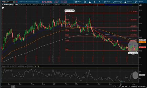 Aspectos que en su conjunto mantuvieron la cotización del par de divisas USD/MXN en un rango comprendido por el nuevo mínimo anual -Low 52- registrado el 13 de Agosto ubicado en 18.5058 Pesos por Dólar y la Resistencia conformada por Exponential Moving Average (EMA) 50 -señalado en color azul- ubicado al momento de redactar el presente en 18.8465 Pesos por Dólar, cerrando la jornada del viernes 15 de Agosto en 18.7370 Pesos por Dólar en el Mercado Spot en torno al EMA 20 -señalado en color rojo-, dejando abierta la posibilidad de aproximarse al Low 52, incluso de registrar uno nuevo, mientras que del lado opuesto la cotización del par de divisas USD/MXN tiene como Resistencia el máximo semanal antes descrito, seguido del EMA 100 -señalado en color mostaza- coincidente con el 50% de retroceso de Fibonacci y el EMA 200 -señalado en color blanco- ubicados en 19.1354, 19.1617 y 19.3085 Pesos por Dólar respectivamente, lo que sugiere estar atentos de la rotación del dinero para proceder en consecuencia con las estrategias de cobertura financiera correspondientes, pues al estar el RSI en territorio neutral con sesgo disminuido a la baja, cualquiera de los dos escenarios son probables, por lo que no se descarta la posibilidad de que se repita el mismo patrón de comportamiento señalado en entrega previa de nuestro Resumen Semanal de Mercados caracterizado por alta volatilidad sin dirección definida.