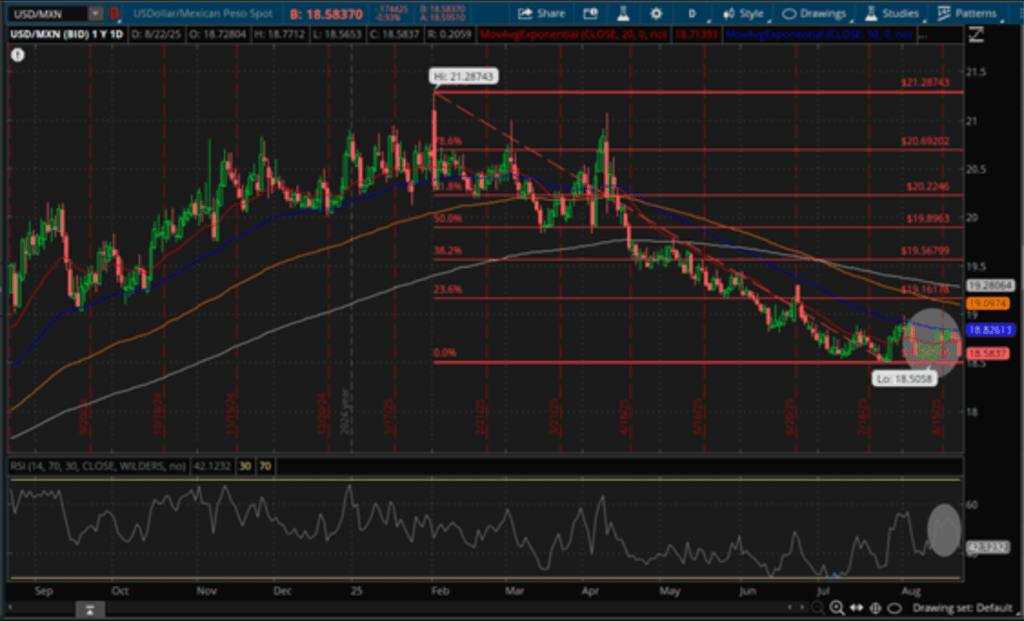 Comportamiento gráfico del $DXY que fue replicado por el par de divisas compuesto por el Dólar Americano vs; el Peso Mexicano (USD/MXN), mismo que se mantuvo dentro de un Canal Lateral -Flat- en un entorno volátil llevando la cotización de un extremo a otro de la banda de fluctuación, teniendo como Resistencia el máximo semanal ubicado en 18.8833 Pesos por Dólar superando momentáneamente el Exponential Moving Average (EMA) 50 -señalado en color azul- y como Soporte el mínimo anual -Low 52- registrado el pasado 13 de Agosto ubicado en 18.5058 Pesos por Dólar, cerrando la jornada del viernes 22 de Agosto en 18.5837 Pesos por Dólar en el Mercado Spot, posicionándose el RSI en territorio neutral con sesgo a la baja como consta en Daily Chart, dejando abierta la posibilidad de que la cotización del par de divisas USD/MXN se aproxime al Low 52, incluso registrar uno nuevo, lo que sugiere estar atentos de los acontecimientos hasta ahora conocidos y los que están por venir y sobre todo, de la percepción que de ellos tenga el Mercado para proceder en consecuencia con las estrategias de cobertura financiera correspondientes acorde con la rotación del dinero.