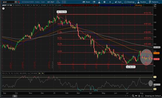 En cuanto al Índice del Dólar Americano, US Dollar/USDX-Index-Cash ($DXY), se mantuvo dentro de un Canal Lateral -Flat- teniendo como Resistencia 98.80 Unidades, superando momentáneamente el Exponential Moving Average (EMA) 50 -señalado en color azul- ubicado en 98.40 Unidades, por debajo del nivel máximo de la semana pasada y como Soporte 97.69 Unidades, sin por ello haber alcanzado el nivel mínimo de la semana pasada, cerrando la última jornada del mes de Agosto en 97.75 Unidades, teniendo como Resistencia inmediata el EMA 20 -señalado en color rojo- ubicado en 98.14 Unidades, posicionandose el Índice de Fuerza Relativa (RSI) de forma lateral en territorio neutral como puede advertirse en Daily Chart, comportamiento atribuido en mayor medida a las tensiones derivadas del despido en disputa de la Gobernadora de la Reserva Federal (FED) Lisa Cook ya que se percibe la posibilidad de que el Poder Ejecutivo pueda impactar negativamente la autonomía del Banco Central y en menor medida a la ligera baja en la confianza del consumidor estadounidense, lo cual ha sido interpretado como un reflejo de cautela en el consumo interno.