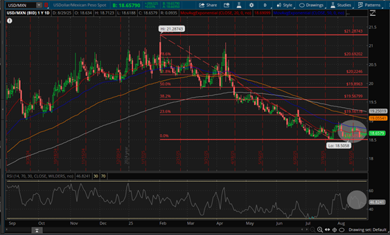 Por su parte, el par de divisas compuesto por el Dólar Americano vs; el Peso Mexicano (USD/MXN), replico una vez más el comportamiento del $DXY al mantenerse la cotización dentro de un Canal Lateral -Flat- alcanzando un máximo semanal en torno al EMA 50 -señalado en color azul- ubicado en 18.7951 Pesos por Dólar y un mínimo semanal en 18.5447 Pesos por Dólar cercano al mínimo anual -Low 52- registrado el pasado 13 de Agosto ubicado en 18.5058 Pesos por Dólar, cerrando la última jornada del mes de Agosto en 18.6579 Pesos por Dólar en el Mercado Spot, teniendo como Resistencia inmediata el EMA 20 -señalado en color rojo- ubicado en 18.6900 Pesos por Dólar, posicionándose el RSI de forma lateral en territorio neutral como consta en Daily Chart, comportamiento del par de divisas USD/MXN enmarcado por la conmemoración del 100° Aniversario del Banco de México (BANXICO) y las reuniones que tendrán los banqueros mexicanos con sus pares y autoridades estadounidenses en los próximos días, en las que abordarán, entre otros temas, la prevención de lavado de dinero, lo cual como podemos inferir genera expectativas en el sector financiero mexicano.