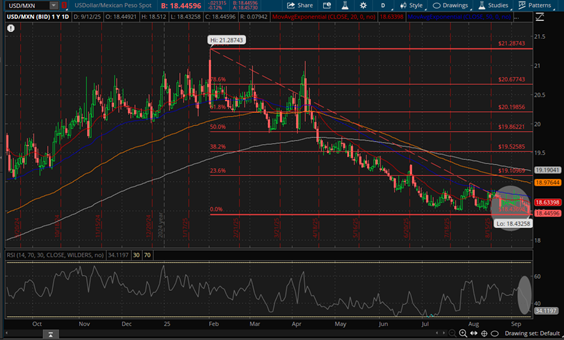 Por su parte, el Peso Mexicano se fortaleció frente al Dólar Americano llevando el par de divisas USD/MXN a registrar el viernes 12 de Septiembre un nuevo mínimo anual -Low 52- ubicado en 18.4325 Pesos por Dólar conforme a lo señalado en entrega previa de nuestro Resumen Semanal de Mercados, cerrando la jornada en 18.4459 Pesos por Dólar en el Mercado Spot, posicionándose el RSI en territorio de Sobreventa (Oversold) con sesgo a la baja como consta en Daily Chart, dejando abierta la posibilidad de registrar un nuevo Low 52 antes, durante o después de la apertura del Mercado en New York la próxima semana en anticipación al anuncio de Política Monetaria de la FED, pese a que el Banco de México (BANXICO) podría hacer lo mismo una semana después llevando la Tasa de Referencia del actual 7.75% al 7.50%.