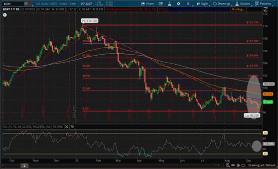 Por su parte, el Índice del Dólar Americano, US Dollar/USDX-Index-Cash ($DXY), no solo se aproximo al mínimo anual -Low 52- como referimos en entrega previa de nuestro Resumen Semanal de Mercados, sino que registró uno nuevo ubicado en 96.21 Unidades justo después de darse a conocer el recorte de 25 Puntos Base que hiciera la FED a la Tasa de Referencia, rebotando desde entonces hasta alcanzar el viernes 19 de Septiembre un máximo semanal en 97.85 Unidades, teniendo como Soporte el Exponential Moving Average (EMA) 20 -señalado en color rojo- y como Resistencia el EMA 50 -señalado en color azul- ubicados al momento de redactar el presente en 97.64 Unidades y 98.03 Unidades respectivamente, destacando que de ser superada de forma sostenida dicha Resistencia, el siguiente objetivo (Target) se encuentra en torno al EMA 100 -señalado en color mostaza-, seguido del 23.6% de retroceso de Fibonacci ubicados en 98.93 Unidades y 99.51 Unidades, los cuáles son susceptibles de ser alcanzados considerando que el Índice de Fuerza Relativa (RSI) se encuentra en territorio neutral con sesgo al alza como puede advertirse en Daily Chart, sin que lo anterior signifique que la tendencia a la baja -Bear Market- se haya revertido, pues para ello es necesario que la cotización se posicione de forma sostenida por arriba del EMA 200 -señalado en color blanco- ubicado en 100.56 Unidades.