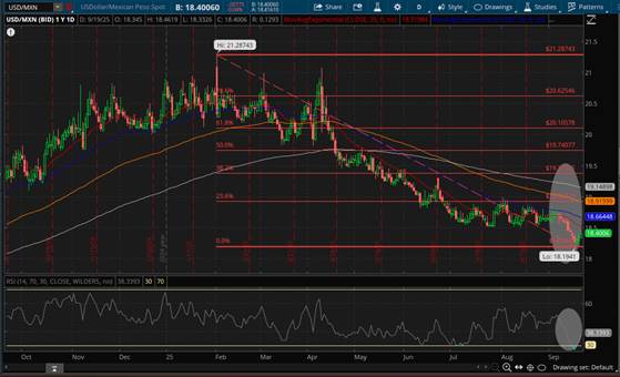 Por lo que las relaciones costo-beneficio y riesgo-recompensa asociadas al Peso Mexicano están divididas en aspectos positivos y negativos, siendo los aspectos positivos el diferencial de Tasas entre la FED y BANXICO, lo cual es alimentado por la expectativa de más recortes a la Tasa de Referencia por parte de la FED, así como la relativa estabilidad macroeconómica manifiesta en el Paquete Económico 2026 presentado la semana pasada, mientras que los aspectos negativos incluyen riesgos políticos internos y sus consecuentes repercusiones legales como las sanciones implementadas por el Departamento del Tesoro de Estados Unidos a la fracción del Cartel de Sinaloa denominada “Los Mayos”, ya que estas sanciones pueden tener implicaciones negativas para el dinamismo económico-comercial binacional, puesto que podrían presentarse bloqueos de activos, restricciones a transacciones financieras internacionales afectando el flujo de remesas, inversiones fronterizas y operaciones de empresas con relaciones transnacionales, baste con tener presente los casos de CIBanco, Intercam Banco y Casa de Bolsa Vector, así como posibles cambios regulatorios inesperados y la dependencia de condiciones externas como las decisiones de Estados Unidos en materia comercial, sin olvidar el incremento del gasto social y la baja recaudación, lo que nos remite a la columna de Enrique Quintana titulada “La decisión de la FED y lo que nos importa en México” disponible en la versión online del Diario El Financiero del 18 de Septiembre, en la que destaca que lo relevante para México no es solo lo que haga la FED, sino cómo afecten esas decisiones el diferencial de Tasas con su contraparte mexicana, BANXICO, la política interna y la confianza del público inversionista.