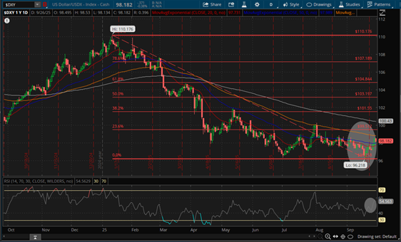 Por su parte, el Índice del Dólar Americano, US Dollar/USDX-Index-Cash, siguió recuperando terreno al cotizarse por arriba de los Exponential Moving Average (EMA) 20 y 50 -señalados en color rojo y azul- ubicados en 97.74 Unidades y 98.15 Unidades conforme a lo señalado en entrega previa de nuestro Resumen Semanal de Mercados, constituyéndose el EMA 50 en Soporte al haber continuado el $DXY su escalada al alza hasta alcanzar un máximo semanal en 98.61 Unidades, cerrando la jornada del viernes 26 de Septiembre en 98.18 Unidades, teniendo como Resistencia el EMA 100 -señalado en color mostaza- ubicado en 98.80 Unidades, ligeramente por debajo del 23.6% de retroceso de Fibonacci ubicado en 98.93 Unidades, nivel que de ser superado de forma sostenida daría lugar a un objetivo (Target) en 100.00 Unidades, seguido de 100.38 Unidades que es donde se encuentra el EMA 200 -señalado en color blanco-, lo cual desde el punto de vista Técnico es factible considerando que el Índice de Fuerza Relativa (RSI) se encuentra en territorio neutral con sesgo al alza como puede advertirse en Daily Chart.