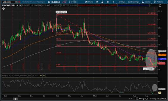 Sin embargo, desde el punto de vista Fundamental, es oportuno tener presente que las presiones inflacionarias en México se mantienen latentes, lo que exige prudencia en la Política Monetaria por parte de BANXICO, partiendo de la premisa que si bien el diferencial de Tasas con la FED aun presenta una ventaja en favor del Peso Mexicano, dicha ventaja podría erosionarse debido a factores externos e internos como un crecimiento económico estancado en México, el cual registró una caída anual del 1.2% en Julio, siendo su peor desempeño desde 2021, destacando fuertes retrocesos sectoriales, pues la actividad agrícola cayó 12.2% y la industrial 2.8%, mientras que los servicios apenas crecieron 0.4%, por lo que diferentes analistas advierten que el deteriorado dinamismo comercial puede arrastrar el desempeño económico del país hacia una recesión técnica en los próximos Trimestres debido a las condiciones generales del entorno tanto interno como externo, lo que podría debilitar el apetito por el Peso Mexicano propiciando su depreciación frente al Dólar Americano.