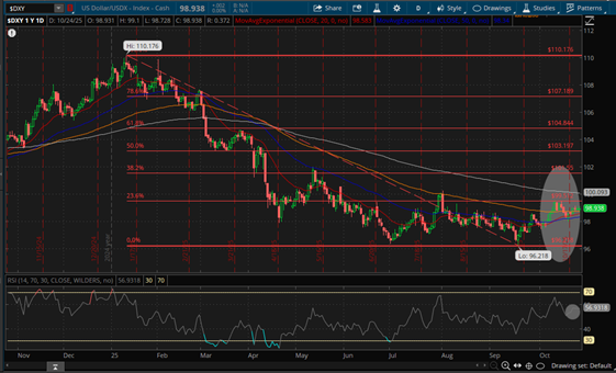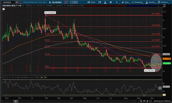 Comportamiento del $DXY parcialmente replicado por el par de divisas conformado por el Dólar Americano vs; el Peso Mexicano (USD/MXN), mismo que se mantuvo la mayor parte del tiempo dentro de un Canal Lateral -Flat- teniendo como Soporte el nivel mínimo de la semana pasada ubicado en torno a 18.3326 Pesos por Dólar y como Resistencia 18.5008 Pesos por Dólar que es donde se encuentra el EMA 50 -señalado en color azul-, mismo que de ser superado de forma sostenida daría lugar a un objetivo (Target) en torno al EMA 100 -señalado en color mostaza-, seguido del 23.6% de retroceso de Fibonacci y el EMA 200 -señalado en color blanco-, ubicados al momento de redactar el presente en 18.7158, 18.9241 y 18.9846 Pesos por Dólar respectivamente, lo cual es factible considerado que la paridad cambiaria del par de divisas USD/MXN cerró la jornada del viernes 24 de Octubre en 18.4545 Pesos por Dólar en el Mercado Spot, al tiempo que el RSI se encuentra en territorio neutral con sesgo al alza como consta en Daily Chart, poniendo de manifiesto que la fortaleza del Peso Mexicano frente al Dólar Americano no se debe a causas imputables al Peso Mexicano sino al debilitamiento del Dólar Americano frente a otros activos como hemos señalado antes, debido a la rotación del dinero ante la incertidumbre derivada de las condiciones generales del entorno económico-comercial y político-social en Estados Unidos y su relación con el mundo, comportamiento que es susceptible de revertirse aun cuando la FED decida recortar una o dos veces más la Tasa de Referencia en lo que resta del año considerando que el público inversionista internacional suele aceptar menores rendimientos a cambio de la “seguridad” que representan los instrumentos considerados “refugio”, destacando por su liquidez el Dólar Americano.
