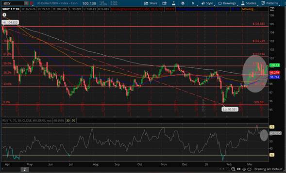 No obstante lo anterior, el Índice del Dólar Americano, US Dollar/USDX-Index-Cash ($DXY), se fortaleció impulsado por la búsqueda de “refugio” llevando la cotización ligeramente por arriba del 50% de retroceso de Fibonacci ubicado en 100.11 Unidades, cerrando la jornada del viernes 27 de Marzo en 100.13 Unidades, dejando abierta la posibilidad de alcanzar la Resistencia conformada por el 61.8% de retroceso de Fibonacci ubicado en 101.19 Unidades en las jornadas por venir, lo cual desde el punto de vista técnico es factible considerando que el Índice de Fuerza Relativa (RSI) se encuentra en territorio neutral con sesgo al alza como puede advertirse en Daily Chart.