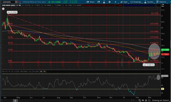 Por su parte, la paridad cambiaria del par de divisas compuesto por el Dólar Americano vs; el Peso Mexicano (USD/MXN), gráficamente replico el comportamiento del $DXY al superar la Resistencia conformada por el 23.6% de retroceso de Fibonacci ubicado en 18.0339 Pesos por Dólar conforme a lo señalado en entrega previa de nuestro Resumen Semanal de Mercados, nivel ahora constituido en Soporte, cerrando la jornada del viernes 27 de Marzo en 18.1109 Pesos por Dólar en el Mercado Spot, teniendo como Resistencia el Exponential Moving Average (EMA) 200 -señalado en color blanco- ubicado al momento de redactar el presente en 18.1788 Pesos por Dólar, mismo que desde el punto de vista técnico es posible que sea superado considerando que el RSI aun tiene camino por recorrer antes de posicionarse en territorio de Sobrecompra (Overbought) como consta en Daily Chart.